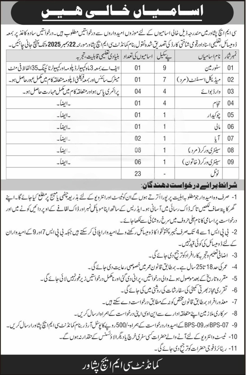 CMH Peshawar Jobs 2025 announced new job opportunities for KPK-domiciled candidates. Applications are invited for multiple positions including **Storeman (BPS-09), Medical Assistant Male (BPS-07), Ward Boy, Barber, Chowkidar, Mali, Aya, and Sanitary Workers (Male/Female)**.