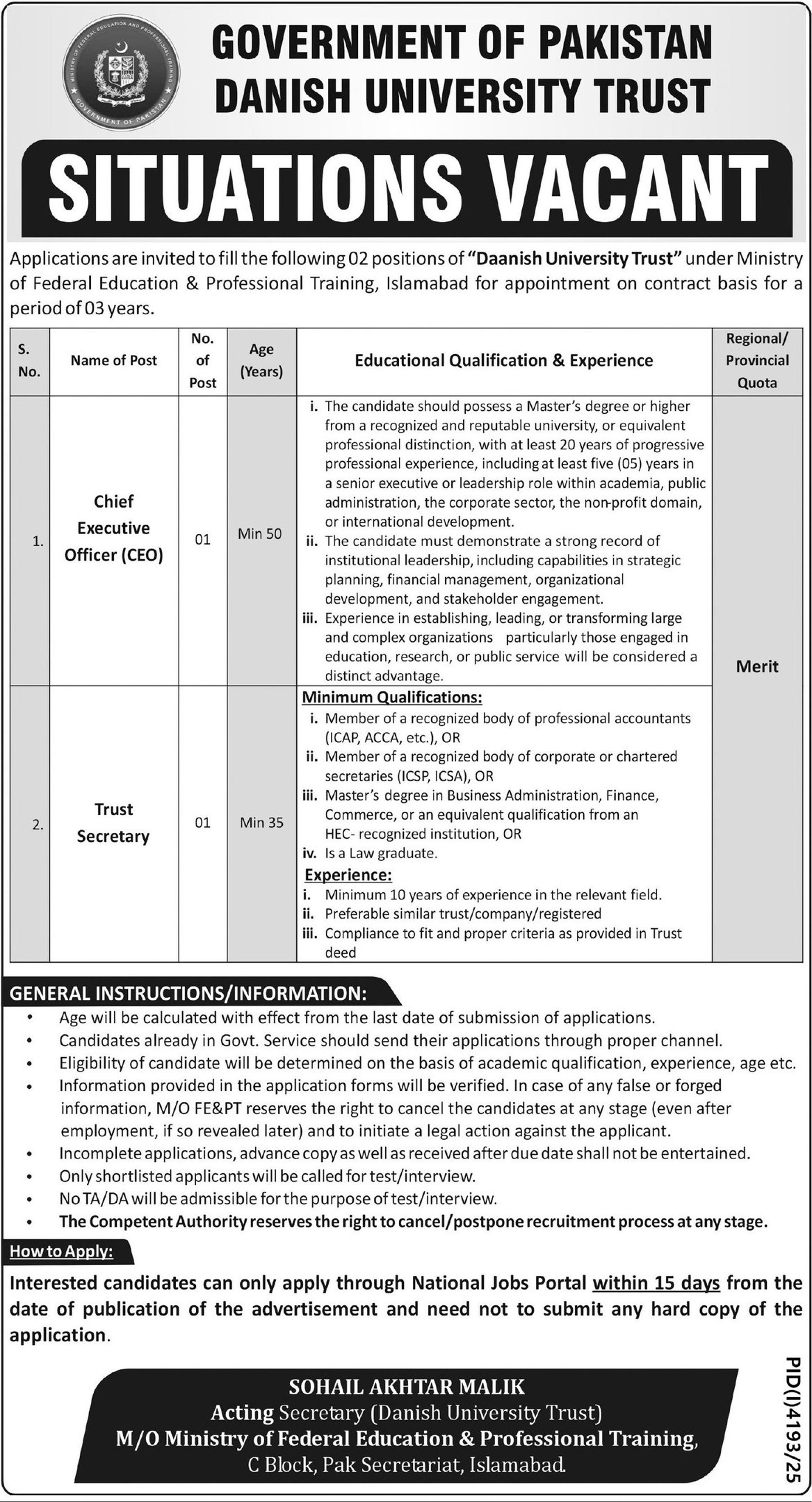 The Ministry of Federal Education has announced the latest Danish University jobs for 2025, including positions for CEO and Trust Secretary. Candidates with a master's degree or higher are encouraged to apply online at njp.gov.pk before the deadline of December 5, 2025.