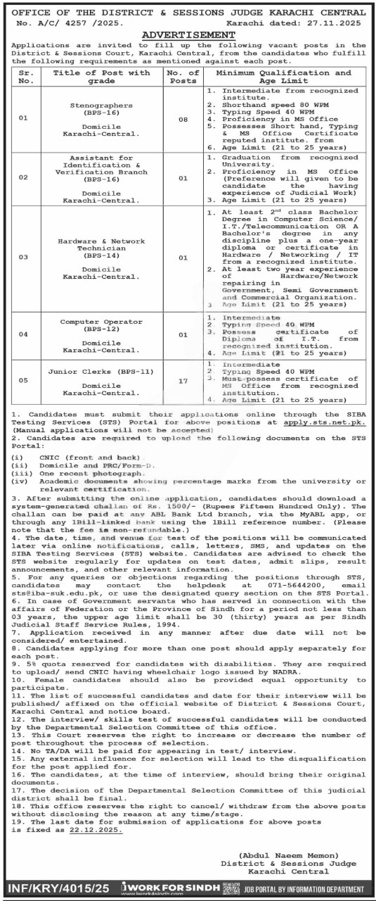 Here you can download the District and Session Court Jobs Karachi 2025 Application Form. Vacancies are available for Stenographer (BPS-16), Assistant for Identification & Verification (BPS-16), Hardware & Network Technician (BPS-14), Computer Operator (BPS-12), and Junior Clerk (BPS-11).