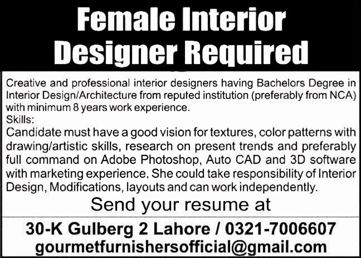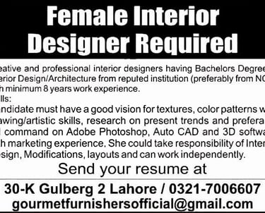 Female Interior Designer Jobs 2026. Gourmet is seeking to hire a Female Interior Designer for Gourmet Furnishers Lahore. The most recent private job openings mentioned are located in Lahore City, and only individuals residing in the specified city are invited to apply.