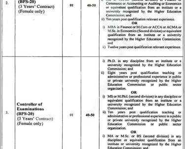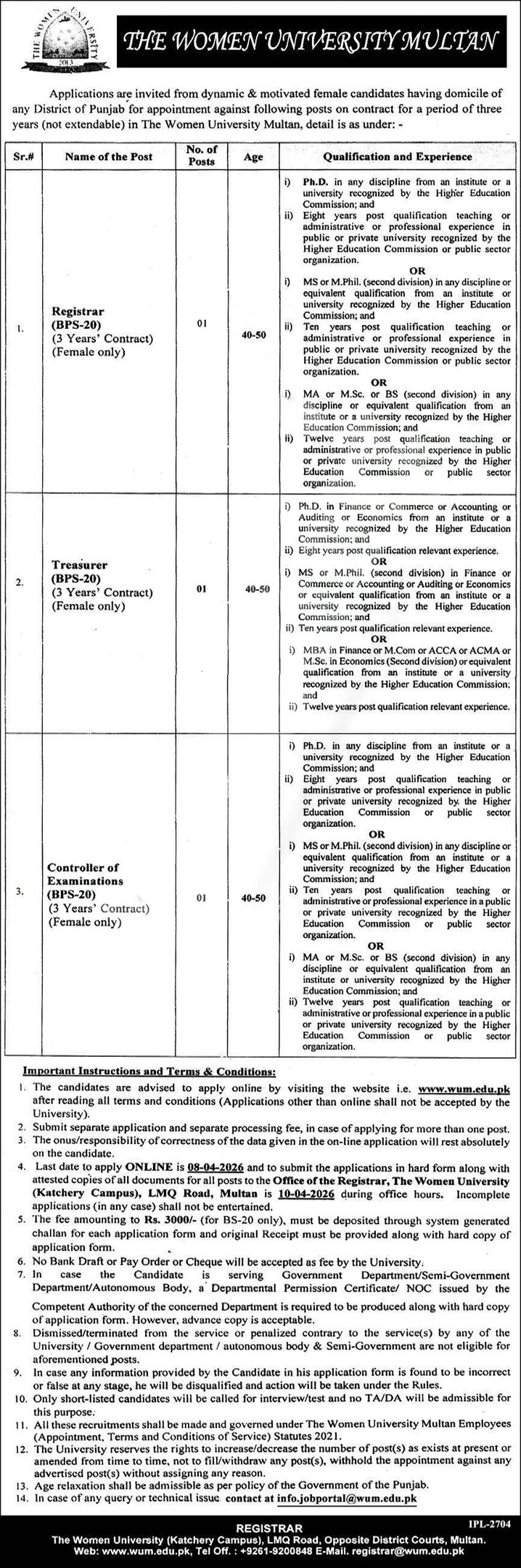 Women University Multan Jobs 2026 for positions titled (Registrar (BPS-20), Treasurer (BPS-20), Controller of Examinations (BPS-20)). Applicants with a PhD / PhD / M.Phil qualification and relevant experience to submit their applications by the deadline of 10th April 2026