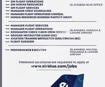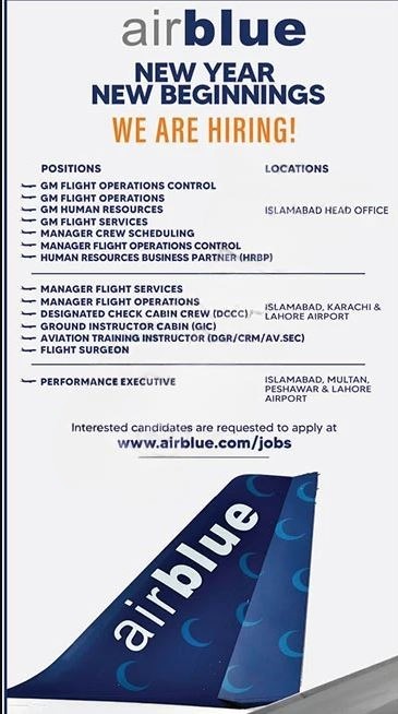 Explore the latest **Air Blue Jobs 2025** in Pakistan by visiting the official Air Blue Job Portal at **[www.airblue.com](http://www.airblue.com)**. The airline is currently hiring highly qualified, experienced, dedicated, and well-disciplined individuals for multiple positions across various departments. **Available Air Blue Vacancies** include roles in: * **Administration:** Deputy Managing Director (Business Development) * **Aeromedical:** Flight Surgeon * **Airside Operations:** Assistant Manager, Coordinator, Associate, Executive, Supervisor, Specialist, Technician * **Flight Services:** Cabin Crew (Trainee), Manager Flight Services * **MIS:** Junior Network Operations Engineer * **Quality Assurance:** Aircraft Engineer Avionics – Quality Assurance * **Terminal Operations:** General Manager Terminal Operations * **Transport:** Coordinator Transport, Senior Executive Performance * **Engineering:** Engineer – Structure Repair Shop, Engineer AWM, Engineer MCC, Manager EBD, Trainee Engineer MCC, Aircraft Engineer – Aerospace, Technician – Aerospace, Technician – Avionics, Assistant Engineer AWM, Planning Engineer, Structure Shop Helper, and more. These positions are part of Air Blue’s Commercial Department and are located in **Karachi and Lahore**. The airline offers **competitive salary packages and attractive benefits** according to its policy. Candidates from across Pakistan may apply through the link provided. Applicants must meet the eligibility criteria mentioned in the advertisement image. Generally, candidates should hold a **Master’s or Bachelor’s degree in the relevant field** from a recognized institution, along with **6 to 9 years of relevant experience**. A complete application procedure is provided below. Interested and eligible candidates are advised to follow the instructions carefully and submit their applications accordingly.