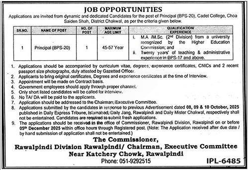 Cadet College jobs Choas Saiden Shah Principal Vacancy 2025