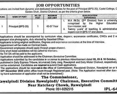 Cadet College jobs Choas Saiden Shah is looking for dedicated professionals for faculty positions in 2025, including a principal vacancy (BPS-20). Qualified candidates with an MA/MSc degree and relevant...