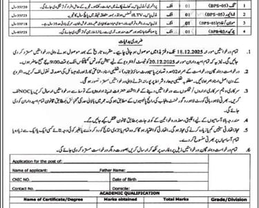 Applications accompanied by verified copies of educational certificates, experience certificates, CNIC, domicile, and current photographs should be sent to the address provided below.