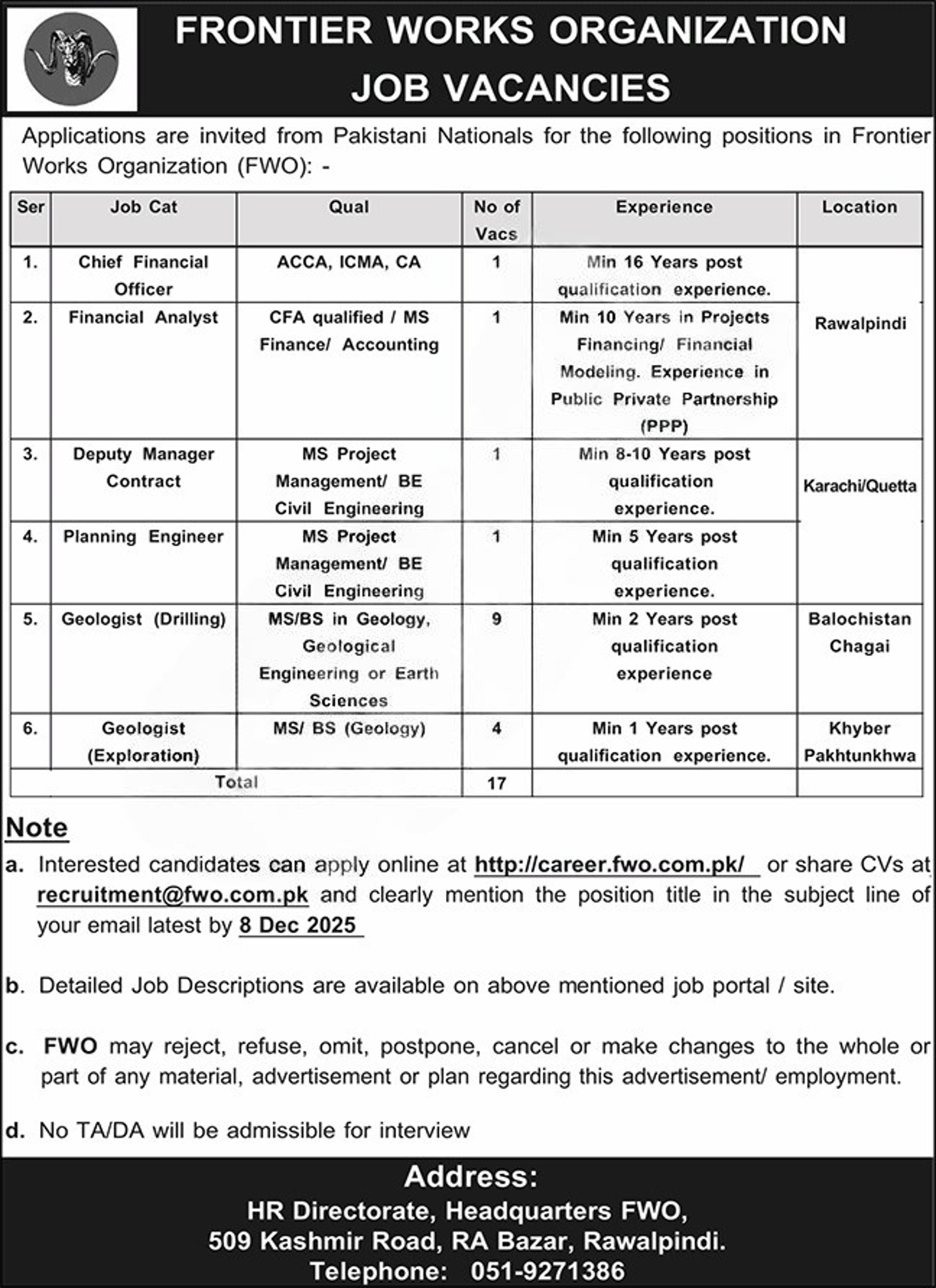 fwo jobs 2025 Explore exciting job opportunities with the Frontier Works Organization (FWO) in 2025. Apply online for various positions including Chief Financial Officer, Financial Analyst, and more. Join a prestigious department affiliated with the Pakistan Army and advance your career today!