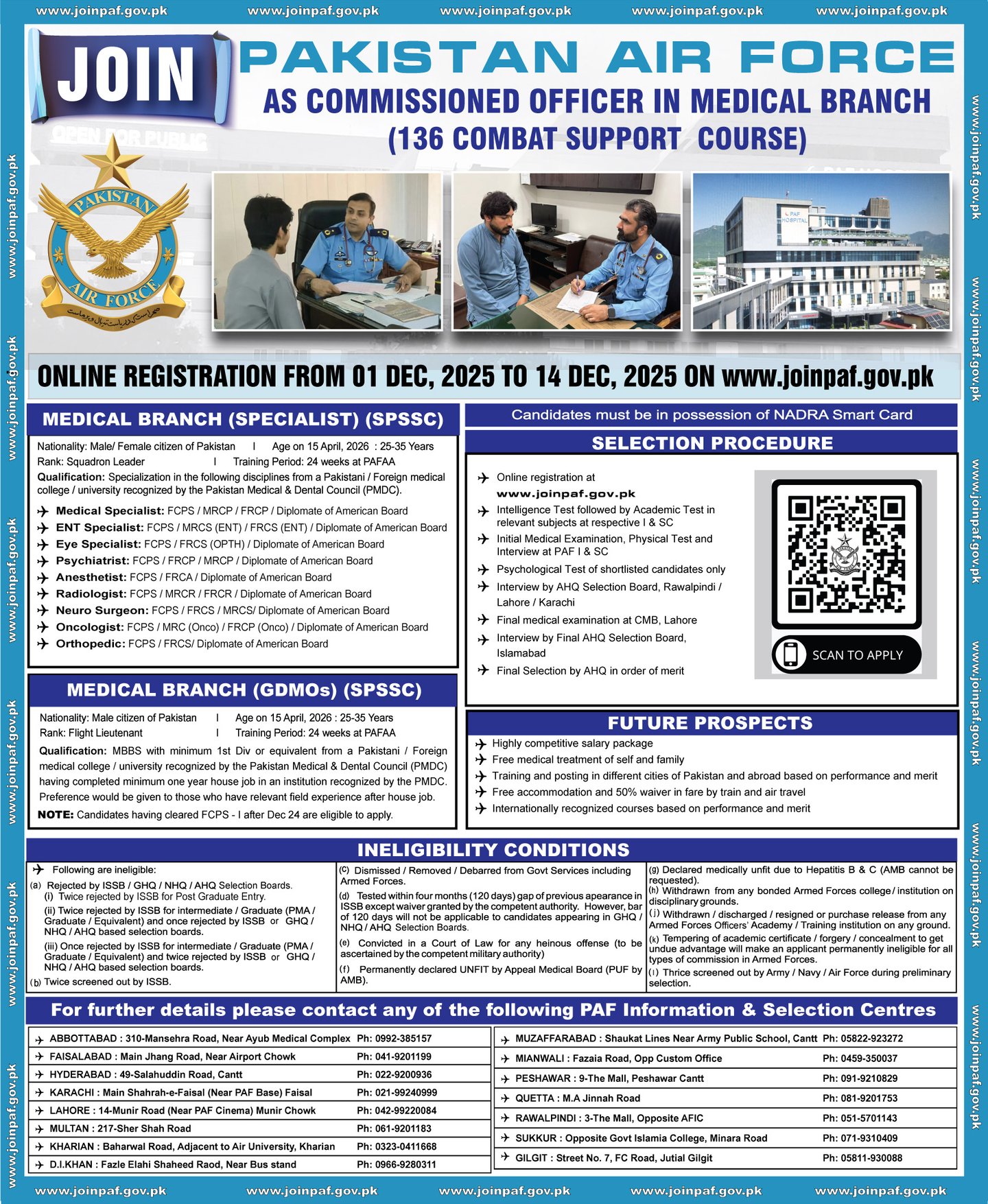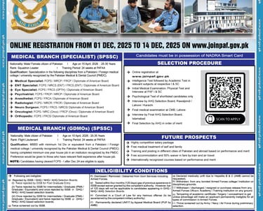 The 136 Combat Support Course offers a unique opportunity for qualified medical professionals to serve as commissioned officers in the Pakistan Air Force. Apply online for specialist doctors and general duty medical officer positions with FCPS, FRCS, MRCP, or MBBS qualifications.