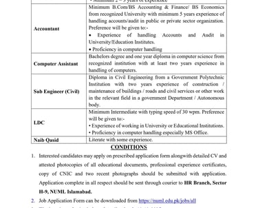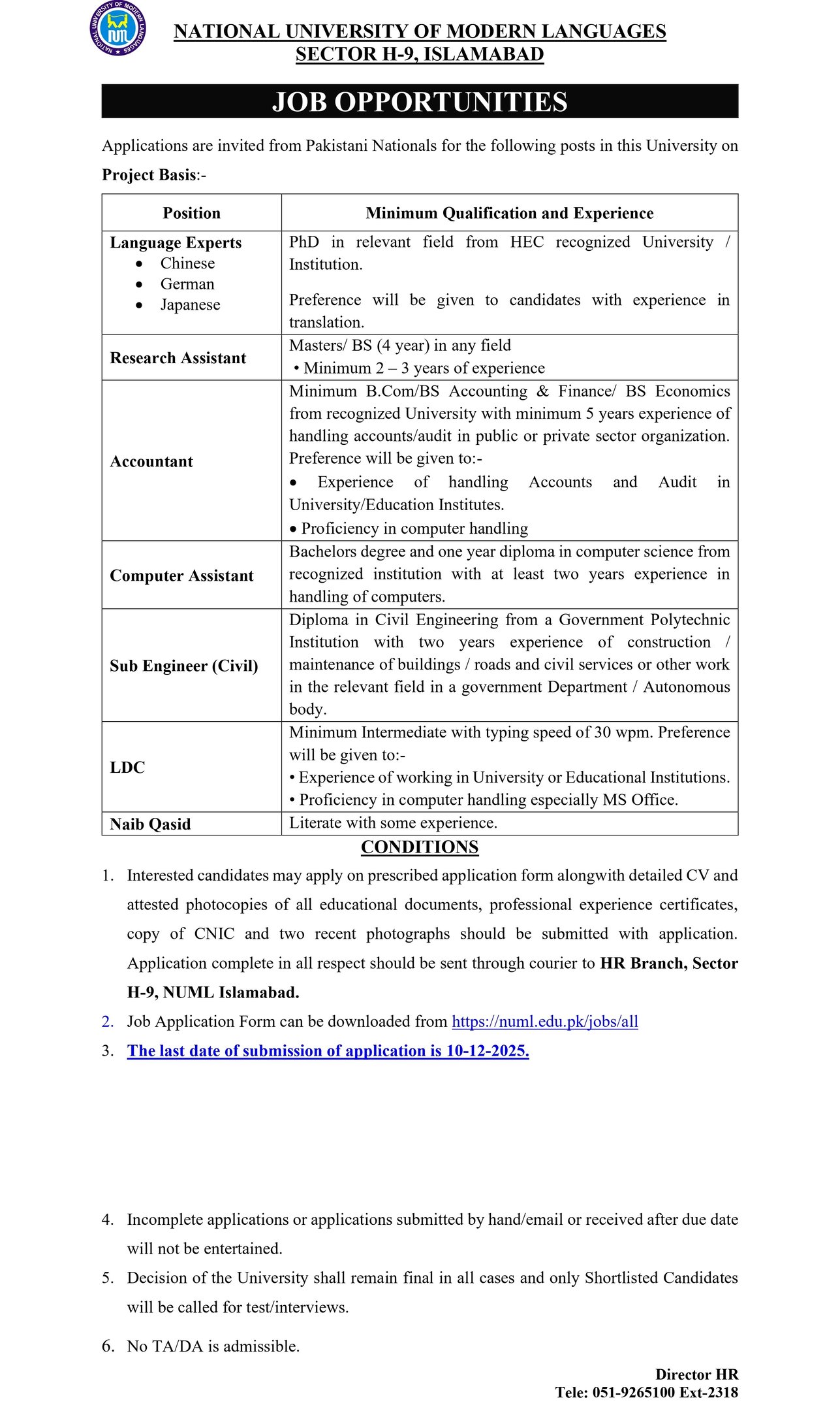 Access the NUML jobs 2025 application form for 2025 to apply for various positions at NUML Islamabad, including language experts, research assistant, accountant, and more. Qualified candidates with relevant degrees are encouraged to apply by December 10, 2025.