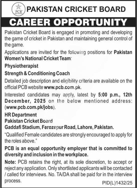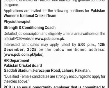 The Pakistan Cricket Board (PCB) is hiring for key roles in 2025 for professionals eager to work with the women's national cricket team. This is a unique opportunity to contribute to the development pcb jobs