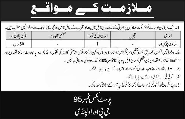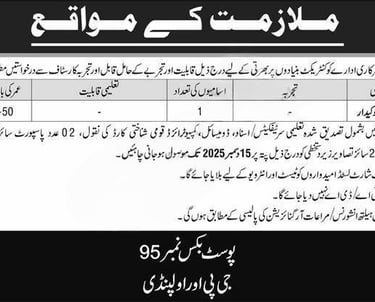 Here you can find the latest career opportunity announced by a Government Organization through PO Box 95 jobs 2025, GPO Rawalpindi. A Public Sector Organization in Rawalpindi is inviting applications from disciplined, qualified, and capable individuals for the following government position.