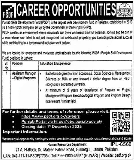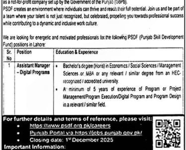 PSDF Jobs is offering positions for **Assistant Manager – Digital Programs** in Lahore. Applicants must meet the required qualifications and experience as outlined in the eligibility criteria.