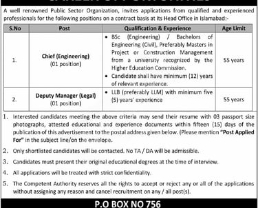 Find the latest **PO Box 756 Islamabad Jobs 2025** from a Public Sector Organization on this page. The organization is seeking **young, energetic, self-driven, committed, and team-oriented professionals** to support the smooth execution of its mission and operations. The available positions are listed below: **Public Sector Jobs in Islamabad:** * **Chief (Engineering)** * **Deputy Manager (Legal)** These positions are based in Islamabad and are offered on an **open-merit basis**. Appointments will be made on a **three-year contract**, extendable based on satisfactory performance. The organization reserves the right to cancel the recruitment process at any stage without providing a reason. Applicants must review the eligibility criteria carefully before applying. In general: * For **Chief (Engineering)**: A Master’s/Bachelor’s degree in the relevant field with **5–12 years of experience**. * For **Deputy Manager (Legal)**: An **LLB/LLM** with relevant professional experience. For complete details regarding qualifications and experience, please refer to the image provided below. The application procedure is outlined next.