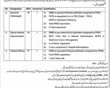 Candidates who meet the criteria are encouraged to submit their comprehensive CVs along with verified copies of their educational certificates, experience certificates, CNIC, domicile, and recent photographs to the address provided below.