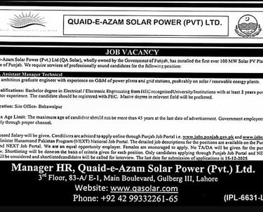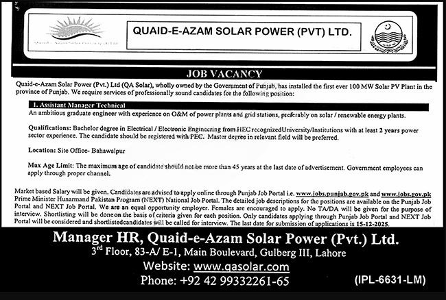 Punjab-domiciled candidates with a bachelor's degree in electrical or electronic engineering are invited to apply for the Assistant Manager Technical position at Quaid-e-Azam Thermal Power Lahore jobs